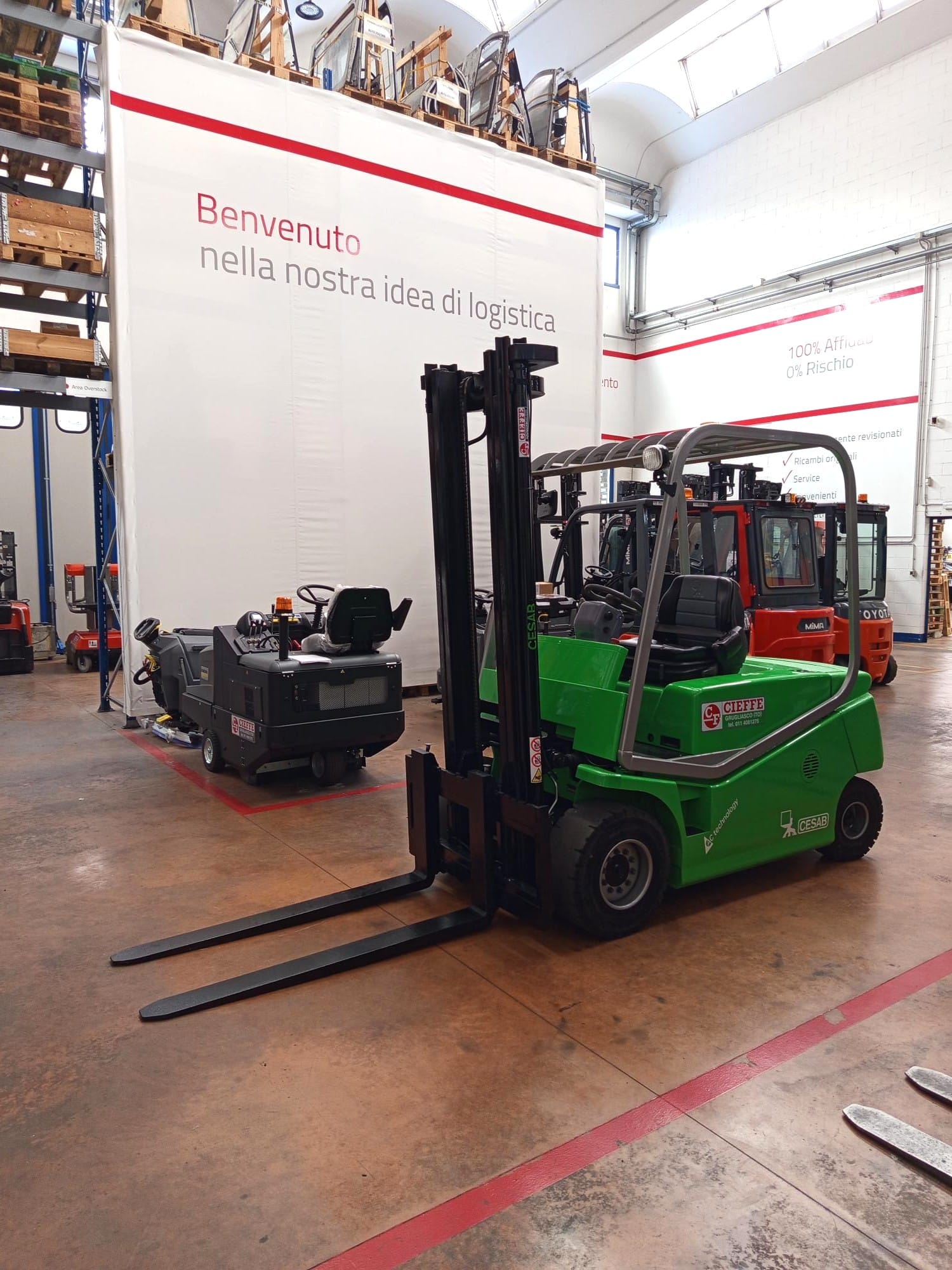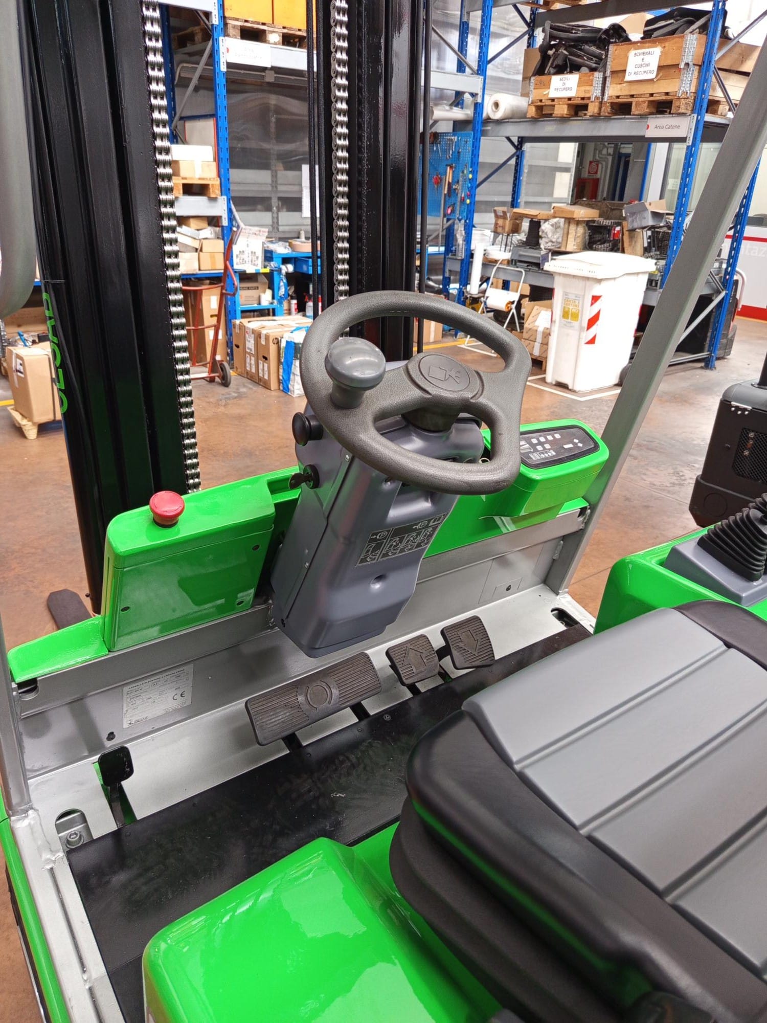 CARRELLO ELEVATORE ELETTRICO CESAB BLITZ 350/AC rif. 602, carrello elevatore frontale elettrico 4 ruote marchio CESAB, mezzo ricondizionato e riverniciato, con montante duplex, batteria con capacità di carica minima del 60/70%, gomme in buono stato e sedile nuovo.